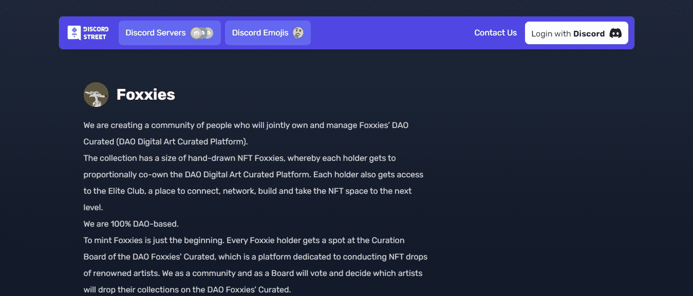 Foxxies Discord 社區,與此列表中的大多數其他 discord 一樣,是另一個致力於 NFT 和加密貨幣的大型社區。它目前擁有大約 19,500 名成員,是可用的最活躍的 NFT 不和諧社區之一。它是 4500 個 NFT 的集合,每個 Foxxie 持有者都可以平等地進入精英俱樂部並擁有 DAO Curated Art Platform。