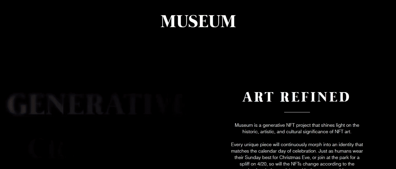 該博物館是一個生成性 NFT 項目,突出了 NFT 藝術的歷史、藝術和文化相關性,與目前有超過 13,850 名志同道合的 NFT 愛好者在討論 NFT。這些 NFT 最顯著的特徵是,每一件獨一無二的作品都會不斷變身為與慶祝日曆日相對應的身份,即,它們會根據加密世界中慶祝的里程碑日而變化,很多就像我們人類在平安夜穿上週日最好的衣服一樣。