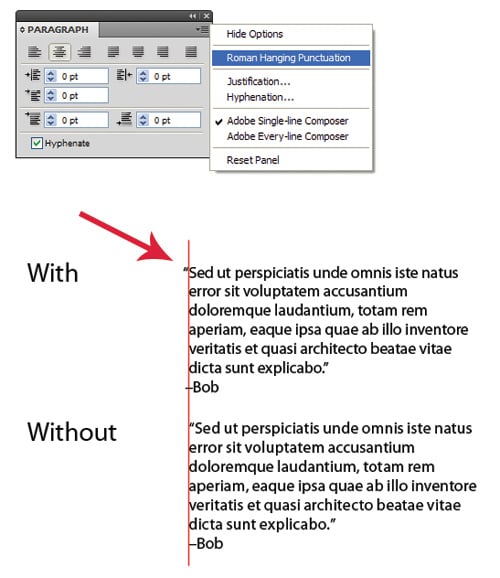 羅馬懸掛標點符號 是一個經常被忽視的排版區域,但是,在大多數情況下,應用它會使您的正文副本的邊緣線條更加清晰。默認情況下,此選項處於關閉狀態,但是您可以在段落工具面板中將其打開。在段落工具面板中,單擊向下的小箭頭(見下圖)以找到額外的選項,然後單擊羅馬懸掛標點符號。您會在這裡找到其他額外的選項,所有這些都值得探索。
