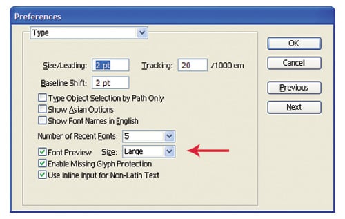 為您的特定項目選擇合適的字體並不總是一件容易的事,所以為什麼不讓自己更輕鬆一點並增加字體預覽的大小。為此,請轉到“編輯”>“首選項”>“字體預覽”>“大”。當您在這裡時,您可能想要探索首選項面板中可用的其他選項,這是許多設計師所忽視的。它可能只會改善您的工作流程。