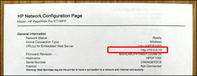 第一步根本不涉及您的計算機,實際上,只涉及您的打印機。所有網絡打印機都有一個屏幕,其中包含設置和配置信息,這些信息通常可以打印到測試表上。這正是我對 HP 所做的,它產生了以下內容: