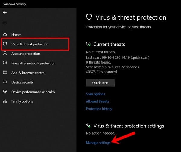 點擊打開 Windows 安全按鈕。轉到病毒和威脅防護 >點擊管理設置。