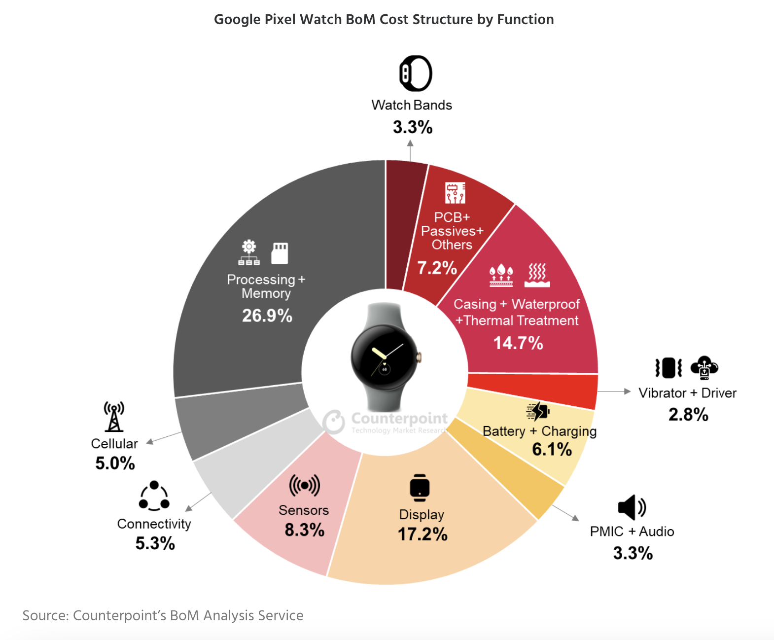 Um estudo da Counterpoint Research mostra que a lista de materiais do Pixel Watch ( BoM) é estimado em cerca de US $ 123, incluindo vários fatores, como materiais usados, hardware interno, caixa e tela, para citar alguns. O interessante é que o hardware usado para processamento e memória do relógio ocupa a maior porcentagem desse custo total, chegando a 26,9%.