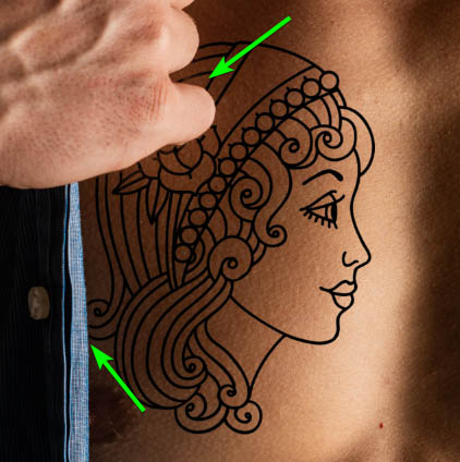 Se partes da tatuagem devem ser ocultadas por causa de coisas que cobririam uma tatuagem real ou na lateral dos braços e pernas, você pode ocultar essas áreas com uma máscara de camada. No meu exemplo, a mão do homem e um pouco da camisa cobririam partes da tatuagem.