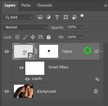 Depois de converter a camada em um objeto inteligente, você pode acessar e usar a ferramenta Liquify. Este filtro permite que você deforme a tatuagem para caber na parte do corpo em que a colocou.