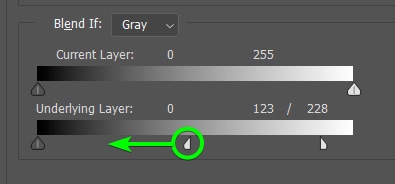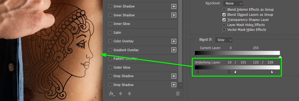Mova a janela Layer Styles para o lado da área de trabalho para ver a tatuagem enquanto ajusta os controles deslizantes. Em seguida, para mesclar a camada de tatuagem com a camada de fundo onde estão os destaques, deslize o ponto à direita para o meio.