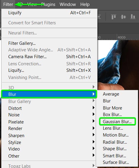 Para reduzir a suavidade da tatuagem que a faz parecer falsa , adicione um filtro de desfoque à tatuagem. Para fazer isso, vá para Filter > Blur > Gaussian Blur.