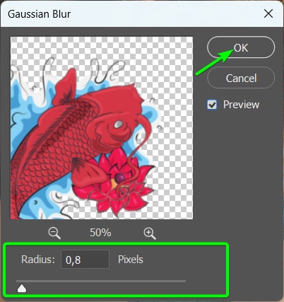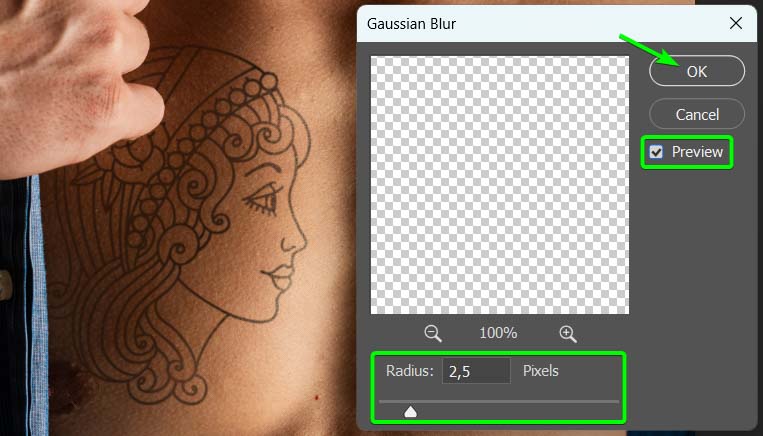 Ajuste o controle deslizante de raio para adicionar um pouco de desfoque a tatuagem sem borrá-la completamente. Clique em OK para aplicar o desfoque.