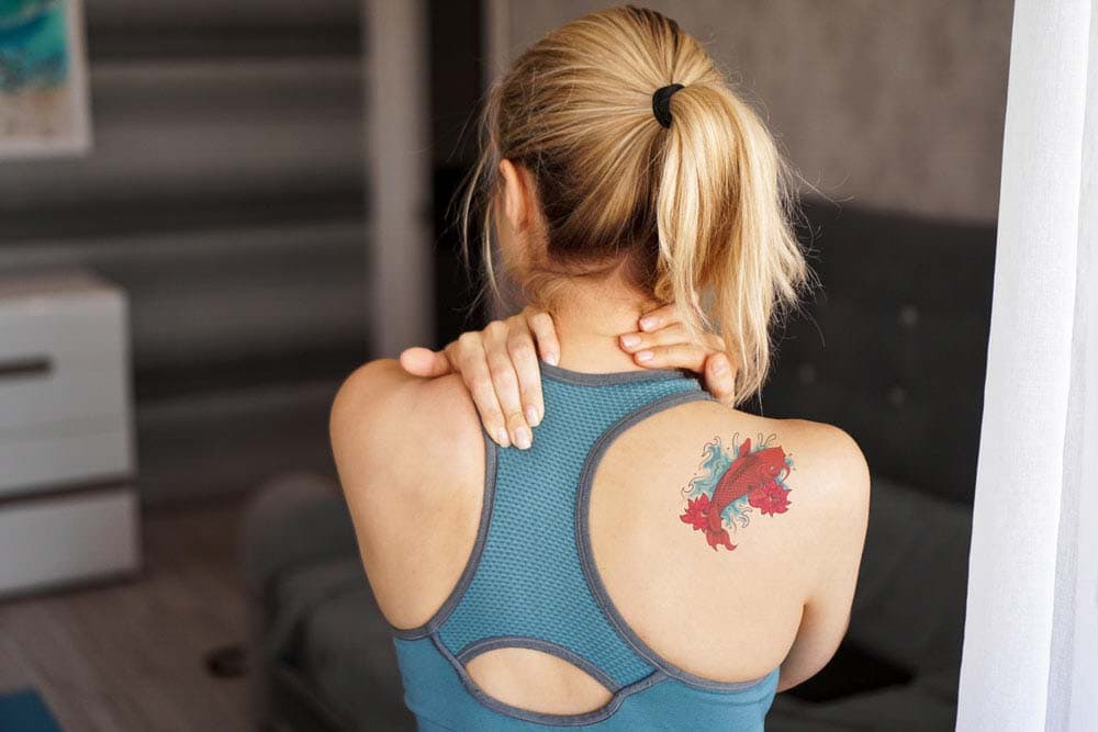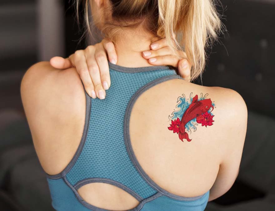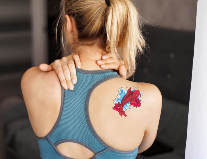 Adicionarei esta tatuagem colorida de peixe na imagem das costas de uma mulher.