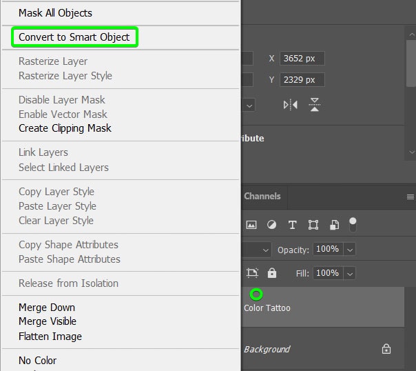 Em seguida, converta a camada de tatuagem em um objeto inteligente clicando com o botão direito do mouse ou Control + clicando na camada e selecionando Converter para Inteligente Objeto.