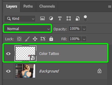 Abra as duas imagens em um documento no Photoshop com a camada de tatuagem no topo. Certifique-se de que a imagem da tatuagem tenha um fundo transparente. Consulte a primeira seção para orientação, se necessário.