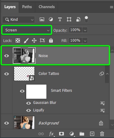 Para mesclar melhor o efeito de ruído, você precisa mude o modo de mesclagem da camada Noise para Screen.