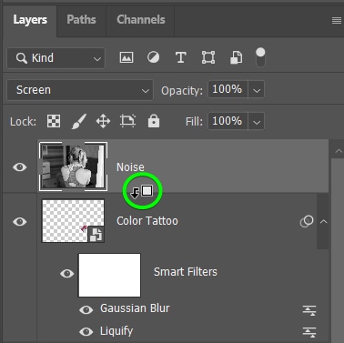 Para recortar a camada, segure Alt (Win) ou Option (Mac) e passe o mouse entre o ruído e a camada de tatuagem até que uma pequena seta apareça apontando para baixo com uma caixa ao lado. Clique para aplicar a máscara de corte.