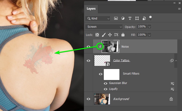 Você notará que a camada Noise tem a seta apontando para baixo para confirmar que a máscara de corte foi aplicada, e o efeito só aparece na tatuagem agora.