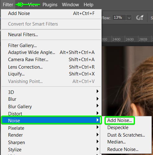 Em seguida, adicione o filtro de ruído acessando Filtro > Ruído > Adicionar ruído.