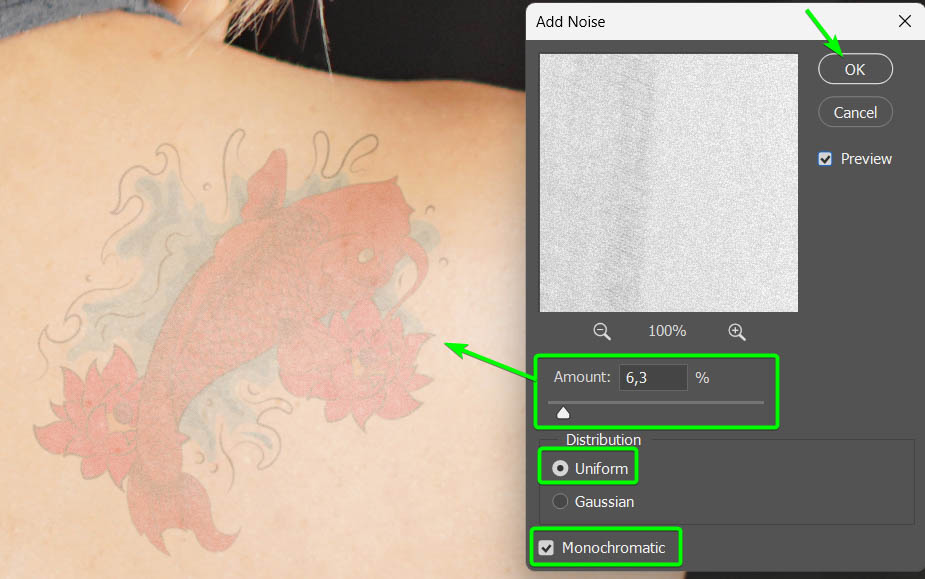 A etapa mais importante ao adicionar uma cor tatuagem em um assunto é adicionar um pouco de ruído.