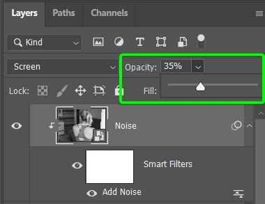 Selecione a camada Ruído, localize o controle deslizante Opacidade no Painel Camadas e reduza-o para cerca de 35% a 50% .
