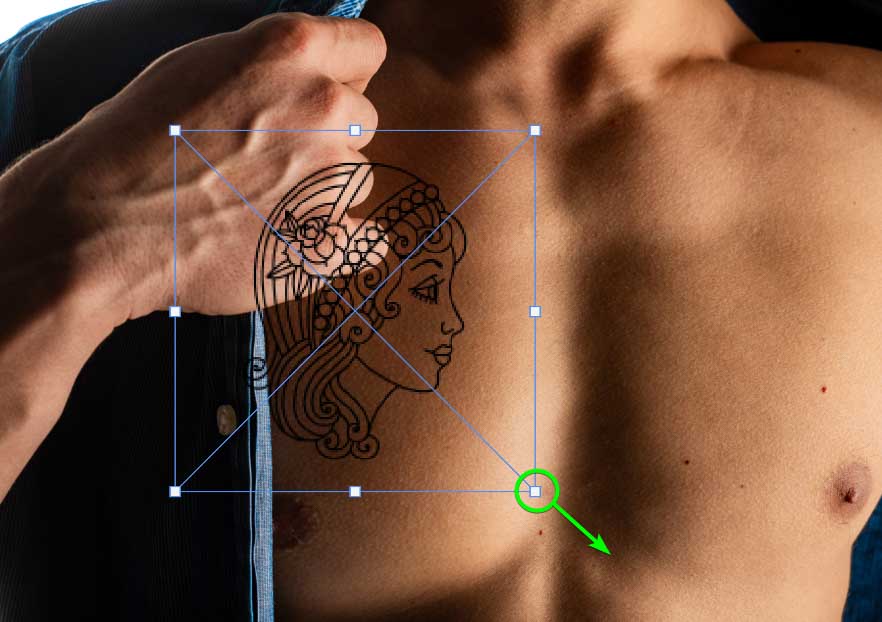 Você também pode usar a Ferramenta Transformar para redimensionar a tatuagem e a Ferramenta Mover (V) para coloque-o onde quiser no corpo.