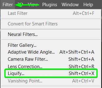 Para adicionar o filtro, vá para Filter > Liquify ou pressione Shift + Control + X (Win) ou Shift + Command + X (Mac).