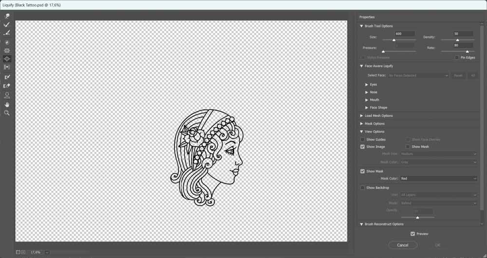 Quando estiver na área de trabalho Liquify, você verá ferramentas no lado esquerdo , a tatuagem na caixa de visualização no meio e configurações adicionais no painel à direita.