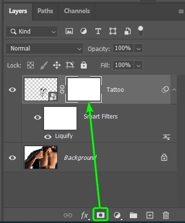 Adicione uma máscara de camada selecionando a camada de tatuagem e clique em Adicionar uma camada ícone de máscara na parte inferior do painel Camadas.