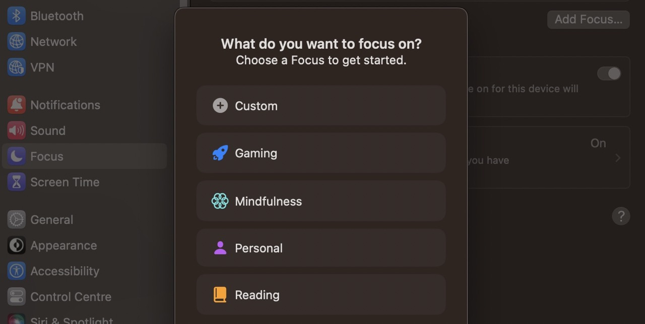 4. Quando a janela pop-up com todos os modos de foco possíveis aparecer, selecione Personalizado.