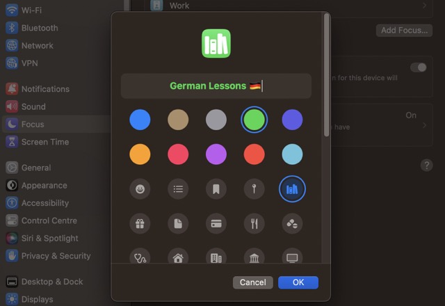 5. Aqui, você pode escolher a cor e o ícone do seu modo de foco. Faça ambos e digite o nome da sua nova criação antes de clicar no botão OK.