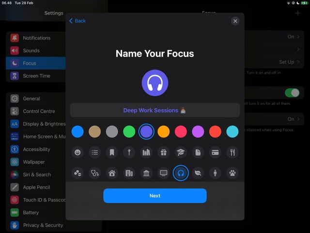 4. Digite o nome do seu modo de foco e selecione a cor e o ícone antes de clicar no botão Avançar.