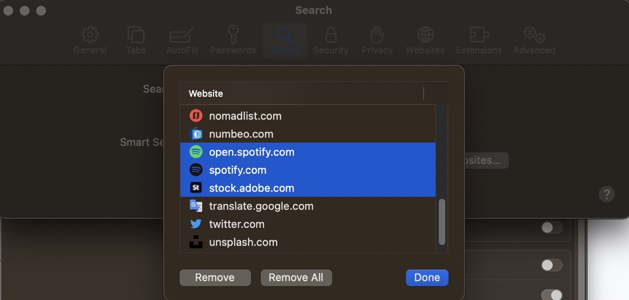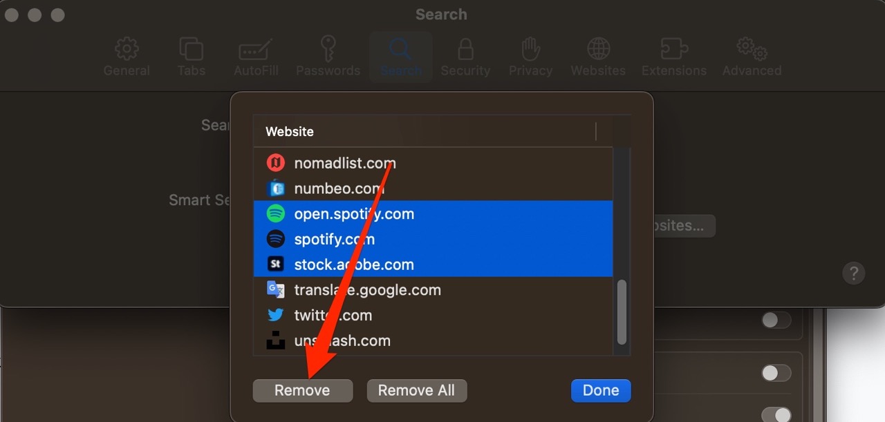 3. Selecione os sites dos quais você gostaria de se livrar. Em seguida, toque no botão Remover.