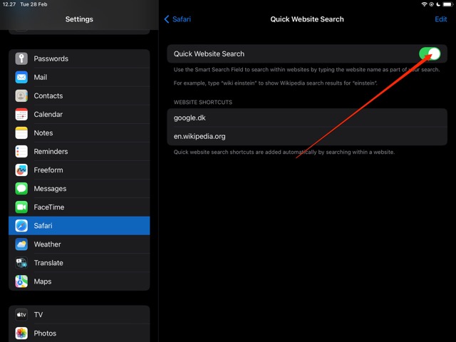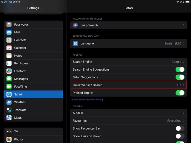 Depois de fazer isso, você poderá ver se seu dispositivo ativou a Pesquisa rápida de sites acessando Configurações > Safari > Pesquisa rápida de sites em seu iPhone ou iPad.