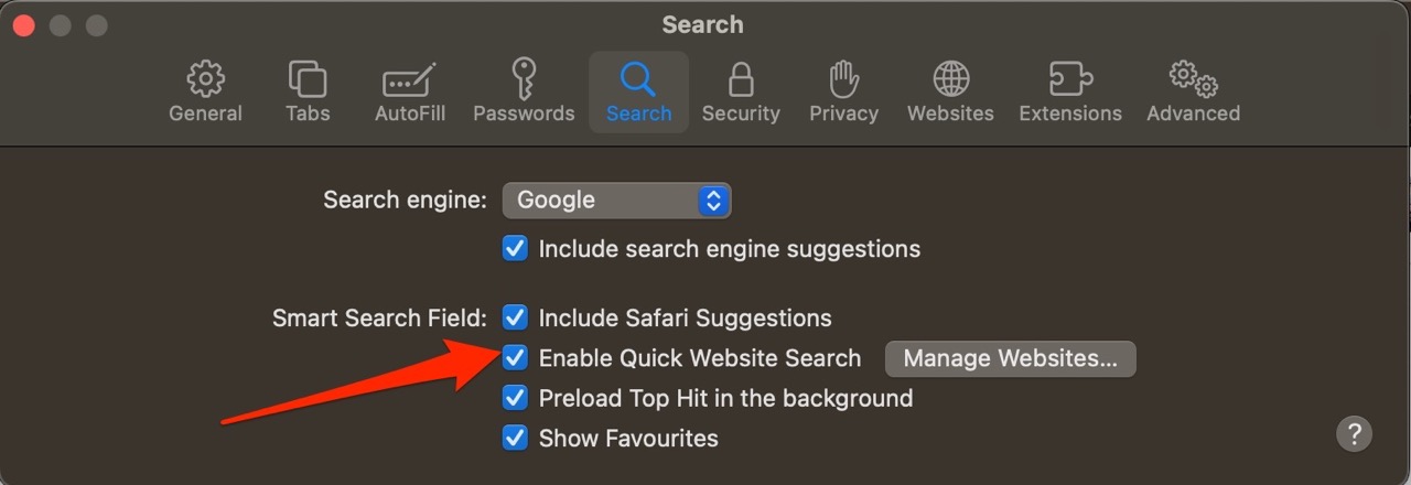 2. Ao lado de Habilitar pesquisa rápida de sites, clique em Gerenciar sites.