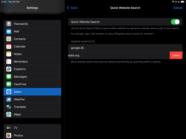2. Deslize para a esquerda no site que você deseja remover da Pesquisa rápida de sites. Em seguida, pressione o botão Excluir quando ele aparecer.