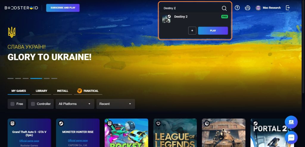 3. Em seguida, clique no botão de pesquisa na parte superior, digite Destiny 2 e clique no botão Jogar que aparece abaixo do nome do jogo.