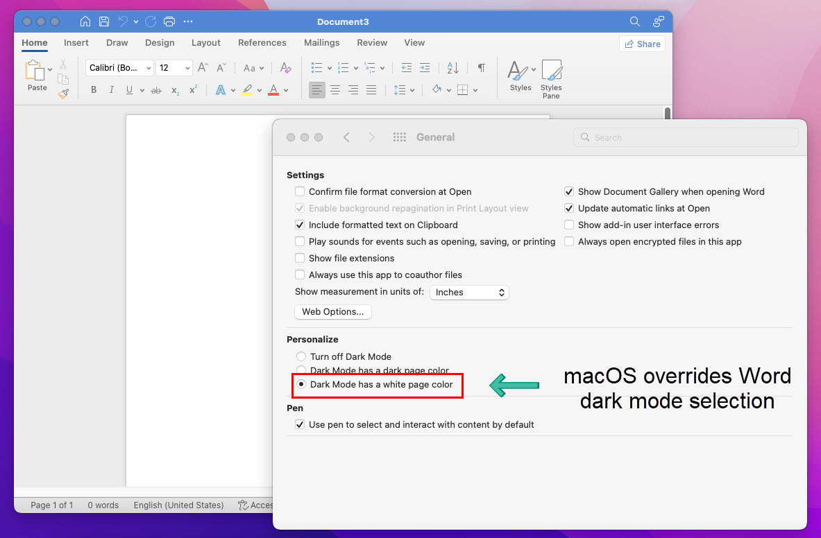 Vá para Preferências do Word e selecione Geral. Em Personalizar, escolha O modo escuro tem uma cor de página branca. Feche a caixa de diálogo e vá para um documento do Word. Agora você vê uma tela branca no modo escuro.