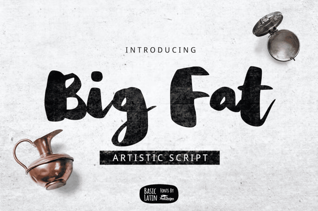 Big Fat é uma fonte de script artística que é adequado para vários conceitos de design. Essa fonte gorda multifuncional é perfeita para logotipos, citações, cabeçalhos, títulos e muito mais. Você obterá essa fonte nos formatos de arquivo TTF, OTF e EPS. Inclui latim básico, como caracteres, números e símbolos padrão do inglês.