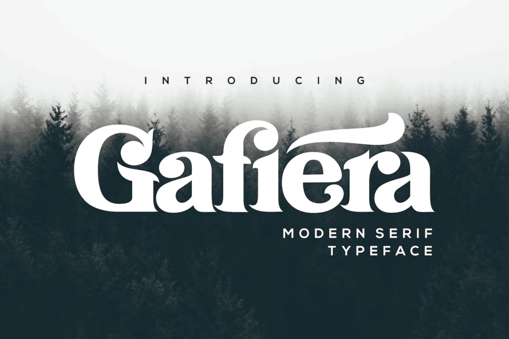 Gafiera é uma fonte serifada moderna com caracteres gordos. Esta fonte é perfeita para qualquer design moderno para adicionar uma aparência artística. É adequado para projetos de branding, designs de papelaria, designs de publicidade, cartões de convite, decoração de casa, capas de livros, eventos especiais e muito mais.