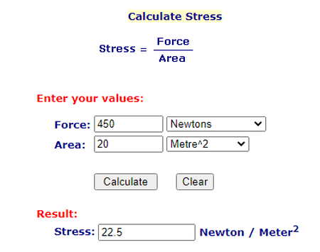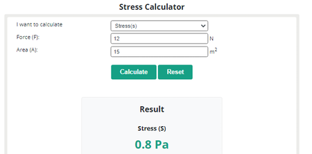 Visite este site e acesse a Calculadora de estresse. Depois disso, insira manualmente os valores de Força e Área. Em seguida, clique no botão Calcular para visualizar o valor de estresse calculado.