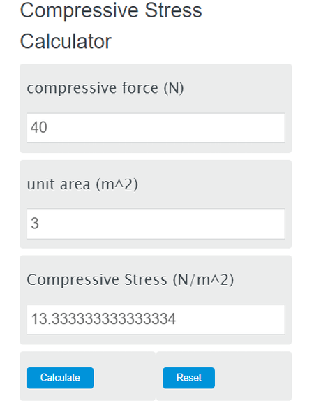 Inicie este site e abra a Calculadora de tensão de compressão. Agora, insira manualmente os valores de Força Compressiva e Área da Unidade. Em seguida, clique no botão Calcular para iniciar o processo de cálculo. Por fim, visualize o valor da tensão compressiva.