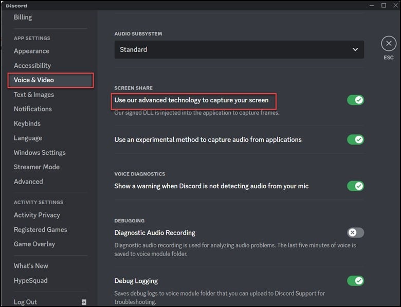 Depois de executar as etapas acima, tente a opção de compartilhamento de tela com o Discord novamente. Se o problema persistir, desative usando as tecnologias mais recentes para Discord.