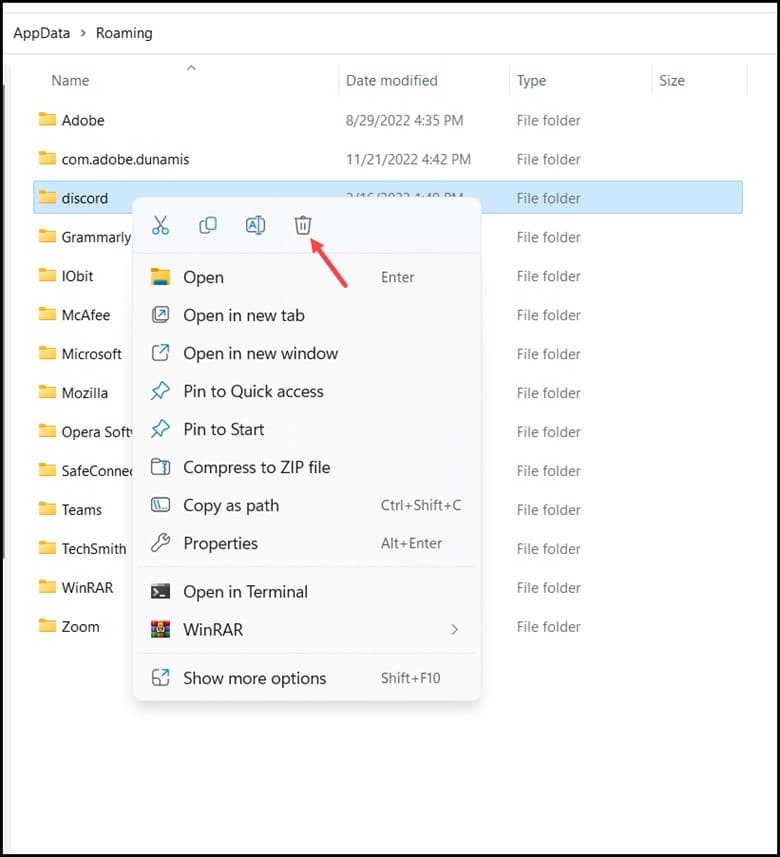 Em seguida, clique na pasta Discord e selecione Excluir.