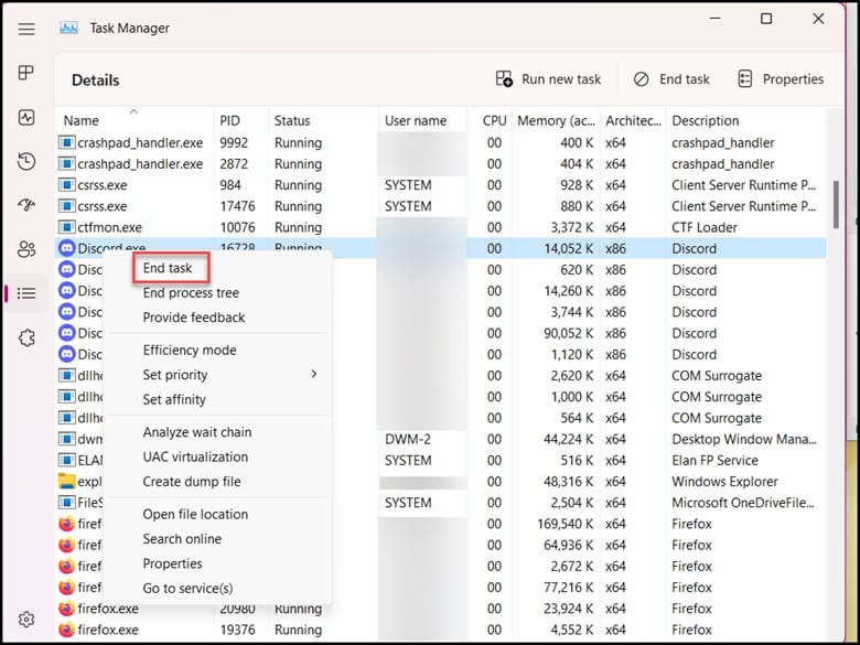 Para fazer isso, clique com o botão direito do mouse no menu Iniciar do Windows e selecione Gerenciador de Tarefas. Vá para a guia de processos e clique com o botão direito do mouse em Discord. Selecione Finalizar tarefa.