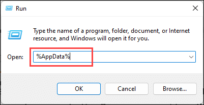Pressione as teclas Windows + R para iniciar o utilitário Executar. Digite %AppData% na caixa de comando Executar e pressione a tecla Enter.