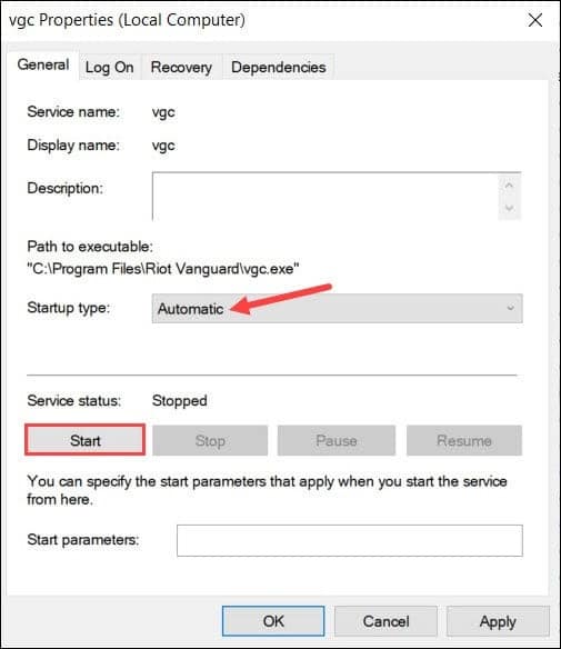 Alterar a inicialização digite o serviço VGC para Automático e clique no botão Iniciar. Clique em Aplicar e depois em OK. Depois disso, reinicie o seu PC.