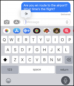Eu estava no meio de uma mensagem de texto para minha filha sobre seu voo pendente esta tarde e pensei que seria bom enviar a ela um mensagem de voz”boa viagem”. Aqui está o que eu estava vendo no aplicativo “Mensagens” no meu iPhone executando o iOS 13: