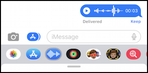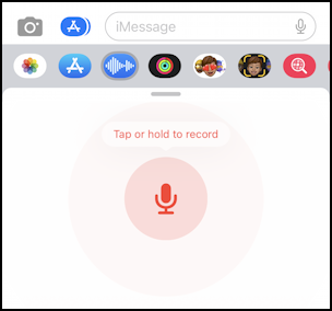Para realmente gravar sua voz, você deve utilizar um dos aplicativos de mensagens, cujos ícones aparecem logo acima o teclado. Você pode personalizar e reordenar esses ícones, então o seu pode estar em um formato ligeiramente diferente, mas se você olhar bem para o meu, acima, da esquerda para a direita, você verá Fotos, Aplicativos, Voz (o que queremos!), Activity Ring, Memoji, Talking Memoji (que é, para ser justo, outra maneira de enviar uma gravação de voz!) E GIFs animados.