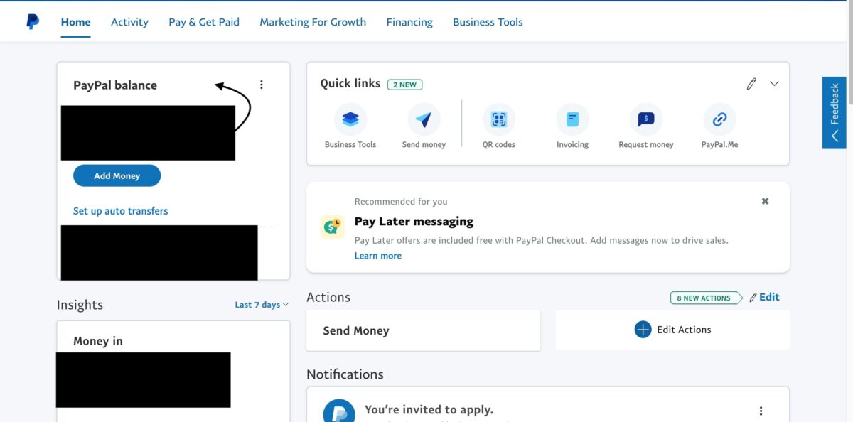 O saldo do PayPal aparecerá no seu painel.
