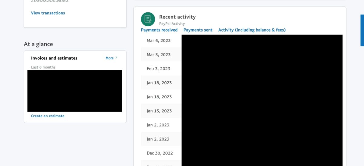 A segunda opção é rolar para baixo até ver a caixa “Atividade recente” em seu painel. A partir daí, você pode visualizar suas transações da última semana e também clicar em “Atividade (incluindo saldo e taxas)” para obter a lista completa de transações, como você veria clicando em “Todas as transações”.