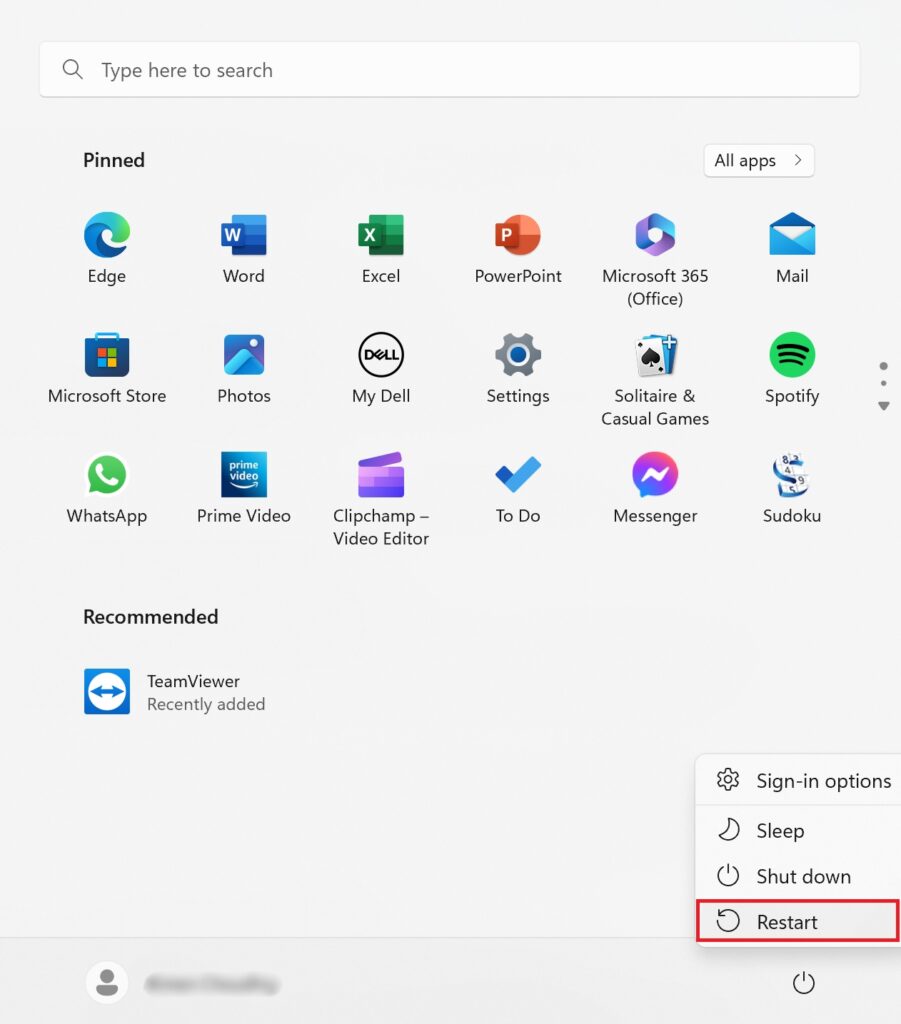 Clique no menu Iniciar na barra de tarefas. Em seguida, clique no ícone de energia localizado no canto inferior direito do menu Iniciar. Selecione Reiniciar nas opções.