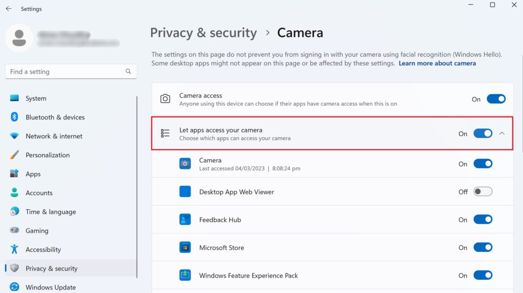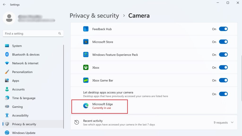 Primeiro, pressione as teclas de atalho Windows + i para iniciar Configurações. No painel esquerdo, clique em Privacidade e segurança. Em seguida, role para baixo, localize Câmera em Permissões do aplicativo e clique nela. Qualquer aplicativo que use a Câmera mostrará uma mensagem Atualmente em uso abaixo dele. Depois de saber qual aplicativo está causando o erro, basta fechá-lo.