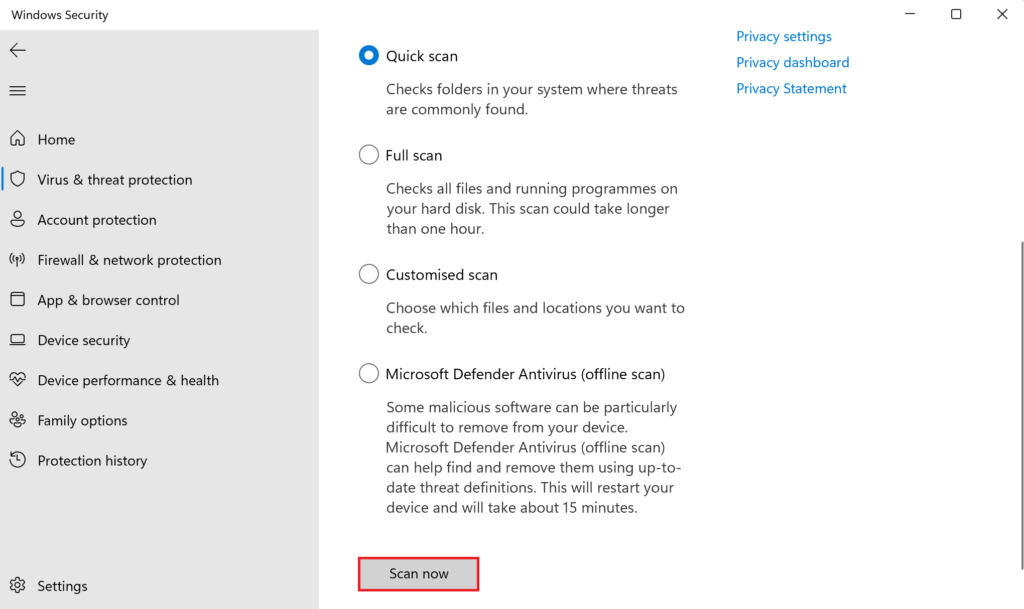A presença de um vírus ou malware em seu sistema também pode levar ao mau funcionamento de sua webcam. Se você suspeitar que esse seja o motivo, tudo o que precisa fazer é executar uma verificação de malware com o Windows Defender padrão ou qualquer outro programa antivírus de terceiros que você pode ter instalado.